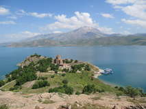 Um die 2010 wieder geweihte und renovierte Kirche zu besichtigen, muss man am Fuß des Artosmassivs auf die alte Klosterinsel Akdamar übersetzen. Die Bootsfahrt macht Spaß und alle genießen die Sonne und das türkisblaue Wasser des Vansees. Gemeinsam betrachtet man zunächst die Außenfassade der fast 1100 Jahre alten Kirche, die mit Reliefen reich verziert ist. Diese zeigen biblische Szenen, Tiere und Fabelwesen. Neu ist das Kreuz auf dem Kirchturm und ein einfacherer Altar im Inneren. Wir schließen daraus, dass die Kirche wieder für armenische Gottesdienste genutzt werden darf, die Souvenirläden sind offensichtlich auch auf armenische Touristen eingestellt. Im Teegarten und in den kleinen Buchten sitzen aber auch viele Einheimische, die hierher einen Ausflug machen. Zufällig besucht auch Johannes, ein Student aus Karlsruhe, Akdamar an diesem Nachmittag. Um 16 Uhr geht es zurück Richtung Van. In einem Imbiss direkt am Seeufer gibt es zur Stärkung für jeden eine Portion Köfte (Fleischklöße) mit Salat im Brotfladen. Gegen 18.30 Uhr sind wir am Hotel. Einige Unermüdliche machen dann in Van bis 22 Uhr noch einen Einkaufsbummel. Am Abend gibt es eine totale Mondfinsternis.