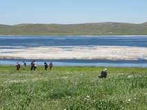 Die Ausgrabung einer urarträischen Festung liegt auf einem Felsrücken in der Ebene von Gürpinar, ca. 25 km von Van entfernt. Die Baukunst der Urarträer und deren Keilschriftinschriften kann man besonders anschaulich an den Resten eines Tempels aus absolut ebenmäßig behauenen Basaltblöcken bestaunen. Vor dem Burghügel breitet sich ein Panorama von saftig grünen Feldern und bunten Blumenwiesen aus; eingerahmt von teilweise noch schneebedeckten Bergen. Die Gruppe nimmt sich eine gute Stunde Zeit zur Erkundung und wird anschließend vom Wächter der Ausgrabung zum Tee eingeladen. Die fruchtbare Ebene wird seit Urzeiten von Bewässerungskanälen durchzogen, die von der reichen (gür) Quellle (pinar) gespeist werden. Die Gruppe besichtigt auf dem Weg zum nächsten Ziel das Quellhaus am Fuß eines unscheinbaren Hügels. Von hier kommt alles Trinkwasser für die Großstadt Van und es ergiesst sich ein Fluss in eine idyllische Landschaft, dessen Wasser so kalt ist, dass man kaum ein Minute aushält Hände oder Füße hineinzuhalten.