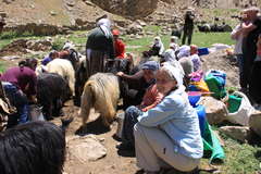 Um 9.45 Uhr machen wir einen weiteren Ausflug. Diesmal geht es erst am See entlang Richtung Edremit, Gürpinar und dann in die südlichen Berge nach Catak zur Kani Spi (Weiße Quelle) wo ein Forellenfest gefeiert wird. Organisiert wird es ebenso wie das andere „Fischfest“ vom Vali von Van. Unterwegs Stopp in einem Dorf mit Forellenzucht. Im Jahr wachsen bis zu 800.000 Forellen heran in mehrere Becken, die von dem klaren Flusswasser durchströmt werden. Die Forellen sind eine kleine, einheimische Sorte. Sehr lecker wie man später erfährt. Auch die Dorfbewohner wollen zum Fest an der Kani Spi aber vorher müssen noch die Ziegen gemolken werden. Unsere Gruppe schaut zu, wie die Herden angelaufen kommt und zu den ca. 20 Melkerinnen getrieben wird. Von jeder Ziege gibt es nur ein wenig Milch, denn auch die kleinen Zicklein müssen noch von der Milch satt werden. Viele Fotomotive. Bei der Quelle kommt sich die Gruppe selbst vor wie Herdentiere, denn es ist wahnsinnig voll. Als Gäste erhalten wir heiß begehrte Sitzplätze und nach einer Weile auch eine gebackene Forelle. Nachdem einige von der Gruppe auch den steilen Aufstieg zur Quelle – die wie ein Wasserfall aus den Bergen stürzt – bewältigt haben, kehren wir zurück nach Van. Am See legt man einen Stopp ein um etwas zu trinken. Am steinigen Ufer bei Edremit viele Badende, auch einer der Karlsruher springt nochmal in den See und verletzt sich leider an einer Scherbe am Fuß. Später Videoabend mit den eigenen Filmaufnahmen im Hotel. Und Vorbesprechung der letzten 2 Tage.