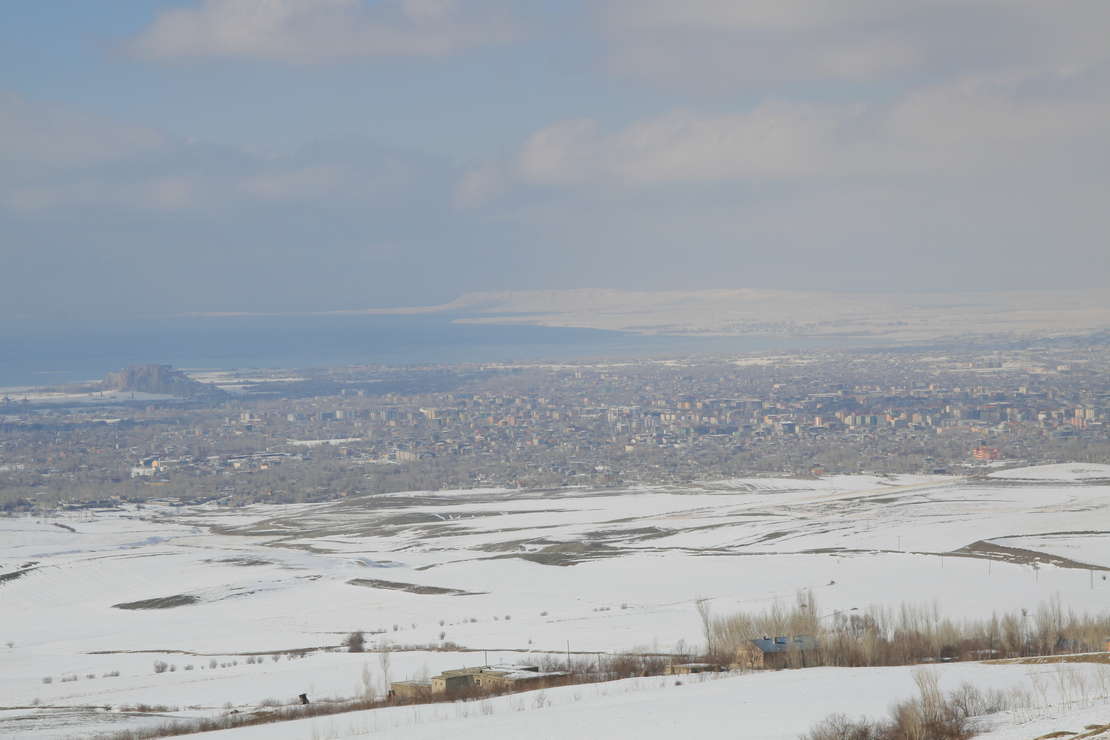 Van, Winterimpressionen im Februar 2008; schneereiche, kalte Winter sind in der Bergregion die Regel. Blick auf Van, der historische Burgfelsen am See ist gut erkennbar.
