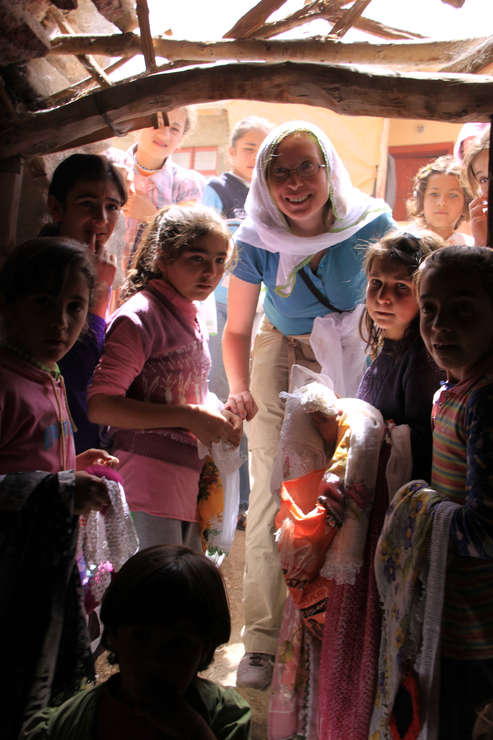 Van Region, Besuch im Dorf Yedikilise (sieben Kirchen), Eingang zu einem Kirchenanhang, der noch als Stall verwendet wird. Die Dorfkinder wollen den Touristen Handarbeiten verkaufen.