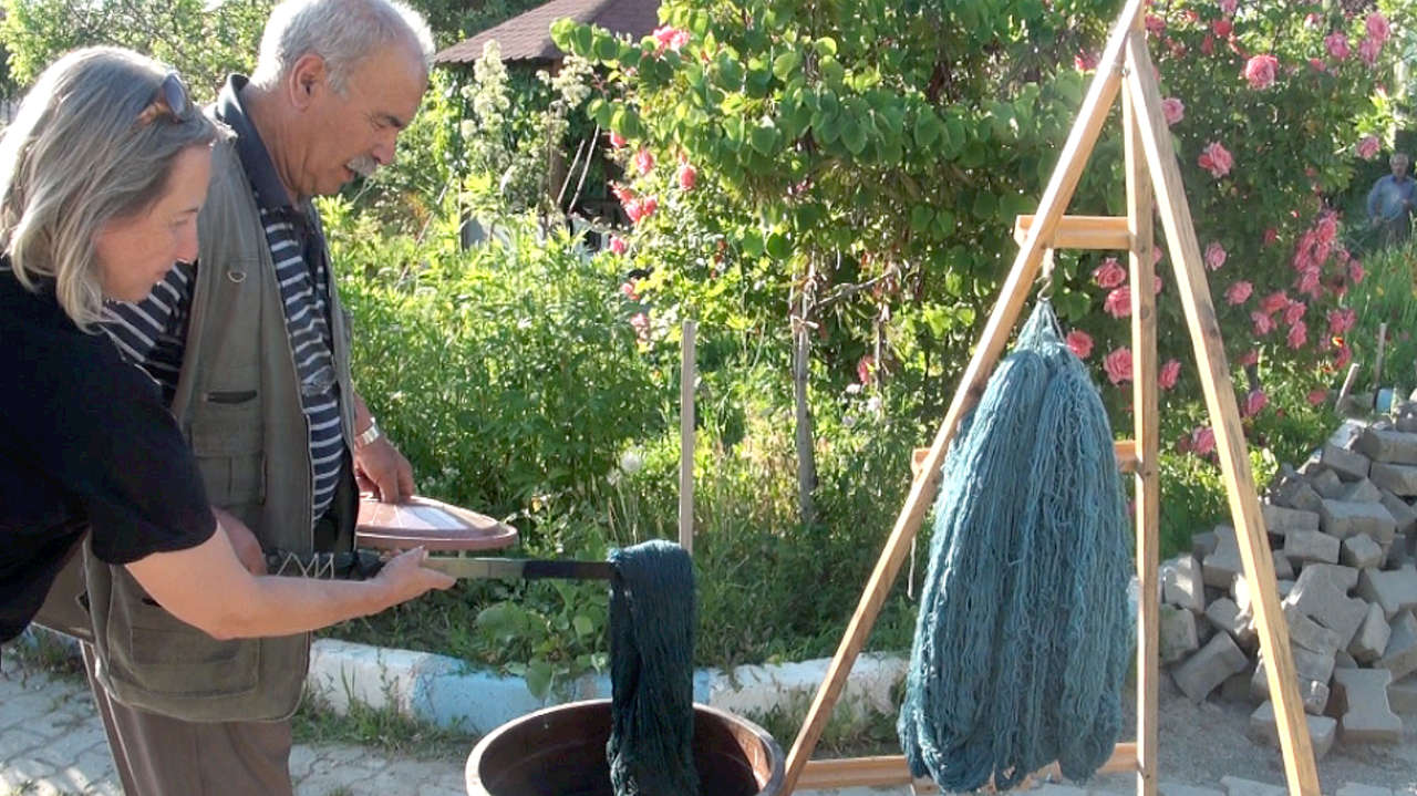 Van, Kelim Atelier, wir dürfen selbst mal ausprobieren, wie Wolle gefärbt oder ein ein Kelim gemacht wird. Hier wird mit Indigo gefärbt.