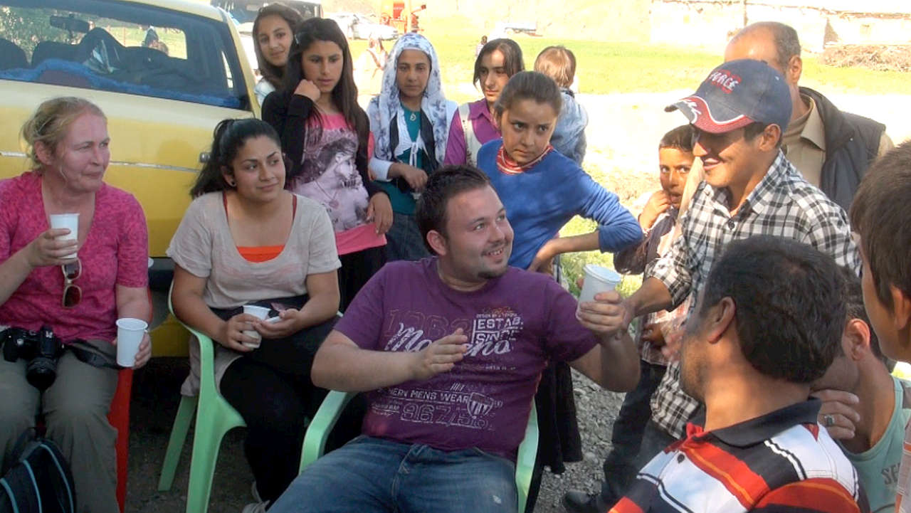 Van, Yedikilise, ein Teil der Gruppe wandert auf dem Heimweg noch über Ziegenpfade in das Dorf Yedikilise. Dort wird Hochzeit gefeiert. Wir bekommen gleich Ayran, Nüsse und Rosinen angeboten. Und einen schattigen Sitzplatz. Eine Wohltat bei der Hitze.