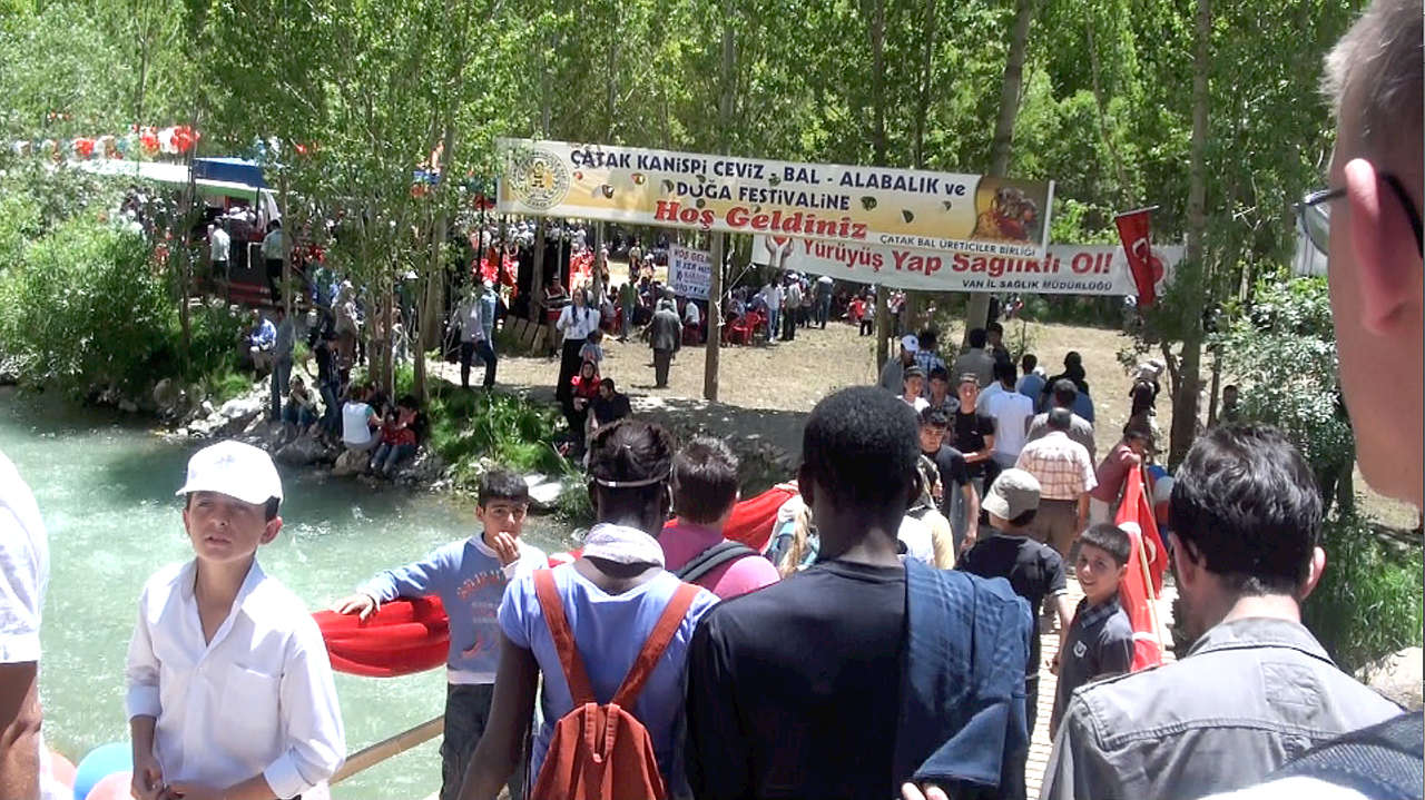 Van, Catak, Kani Spi (weisse Quelle), Honig,- Fisch und Walnussfestival. Hoffentlich hält die Brücke aus Bretter die vielen Menschen aus. Der Fluss ist reissend und eiskalt