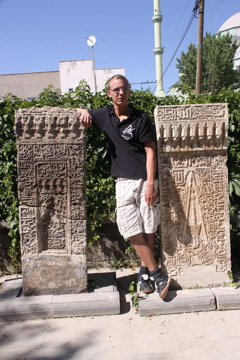 Van, Museum, Dennis zwischen zwei alten seldschukischen Grabsteinen. Die Ornamente und Inschriften sind sehr fein gearbeitet und typisch für die Region um Ahlat, am nördlichen Ufer des Vansees.